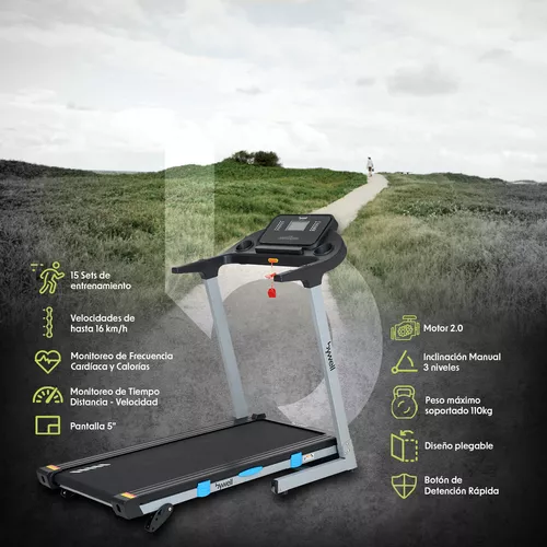 La caminadora Bywell es ideal para entrenamientos en casa. Con un potente motor de 2.0 HP, velocidades de hasta 16 km/h y una pantalla LCD de 5", esta caminadora combina tecnología avanzada y diseño funcional.