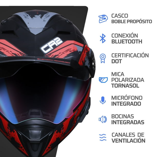 Casco para motociclista doble propósito, Sistema bluetooth de sensor, Certificación DOT, Micrófono y bocinas integradas, Comandos por voz, Mica polarizada tornasol, Visor retráctil, Almohadillas interiores acolchadas