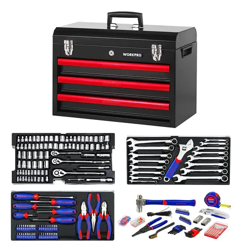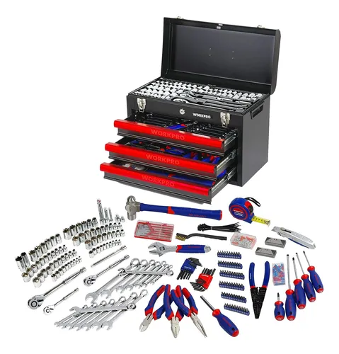 Conjunto de herramientas; Material de alta calidad: herramientas forjadas de vanadio de Chrome para la dureza y la durabilidad. Acabado completo de cromo polaco para protección anticorrosión. Las herramientas manuales de alta calidad cumplen con los estándares internacionales.; 408 piezas de herramientas: incluye la mayoría de las herramientas de uso diario, incluye alicates, destornilladores, llaves Allen, llaves, enchufes, brocas, cinta métrica, cuchillo, martillo, stripper de alambre, etc.; Dimensiones de la caja: 19.685 x 10.63 x 13.78; Caja de herramientas profesionales: este conjunto de herramientas contiene la mayoría de las herramientas necesarias para mecánica o proyectos domésticos. Es ideal para todos los proyectos de ensamblaje, mantenimiento y reparación en el hogar o taller, y también un regalo perfecto para aficionados y trabajadores de bricolaje. Contenido: (1) Cuchillo de utilidad, (20) cuchillas de cuchillo de utilidad, destornillador), destornillador magnético, destornillador manejado (6) destornillador de precisión, conjunto de llave hexagonal métrica, (11) SAE HEX HEY Sets, 6 alicates de nariz largas, 6 diagonal alicates, (1) 6 alicates combinados, (1) 16 oz de martillo de bola de bola, (1) 7.5m (25 pies) Medida de cinta, (8) llaves de combinación métrica: 8, 10, 11, 12, 13, 14, 15, 15, 17 mmm, (8) llaves combinadas SAE: 1/4, 5/16, 3/8, 7/16, 1/2, 9/16, 5/8, 3/4, (1) 8 llave de llave ajustable, (1 ) Stripper, (55) kit de conector, (40) corbatas de cable, (90) kit de hardware, (1) 1/4 mango del Dr. Ratchet, (1) 3/8 Dr. Ratchet Many, (1) 1/2 DR . Ratchet Many, (10) 1/4 6 puntos SAE DR. Sockets: 5/32, 3/16, 7/32, 1/4, 9/32, 5/16, 11/32, 3/8, 7/16, 1/2, (10) 1/4 6 puntos Métrica DR. Sockets: 4, 5, 6, 7, 8, 9, 10, 11, 12, 13 mm, (10) 3/8 6 puntos sae dr. Sockets: 1/4, 5/16, 3/8, 7/16, 1/2, 9/16, 5/8, 11/16, 3/4, 13/16, (11) 3/8 6 puntos Métrica DR. Sockets: 7, 8, 9, 10, 11, 12, 13, 14, 15, 17, 19 mm, (8) 3/8 12 puntos sae dr. Sockets: 5/16, 3/8, 7/16, 1/2, 9/16, 5/8, 11/16, 3/4, (11) 3/8 12 puntos Métrico: 7, 8, 9, 10, 11, 12, 13, 14, 15, 17, 19 mm, (6) 1/2 6 puntos sae dr. Sockets: 1/2, 9/16, 5/8, 11/16, 3/4, 7/8, (6) 1/2 6 puntos Métrico DR. Sockets: 14, 15, 17, 18, 19, 21 mm (1) 1/2 x 3/8 adaptador, (1) 3/8 x 1/4 adaptador, (1) Barra de extensión 1/4x3, (1) 3 /Barra de extensión 8x3, (1) Barra de extensión 3/8x6, (1) Barra de extensión 1/2x5, (2) 3/8 Spark Sockets: 13/16, 5/8. Todos nuestros productos estan en inglés SKU 15112340995