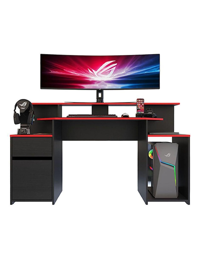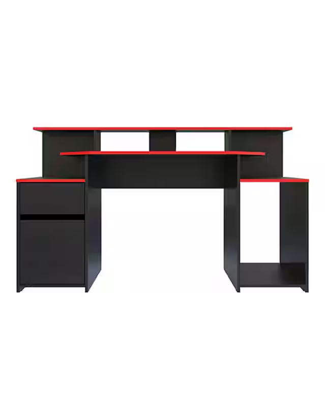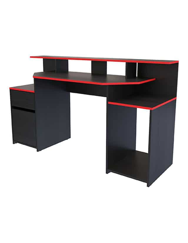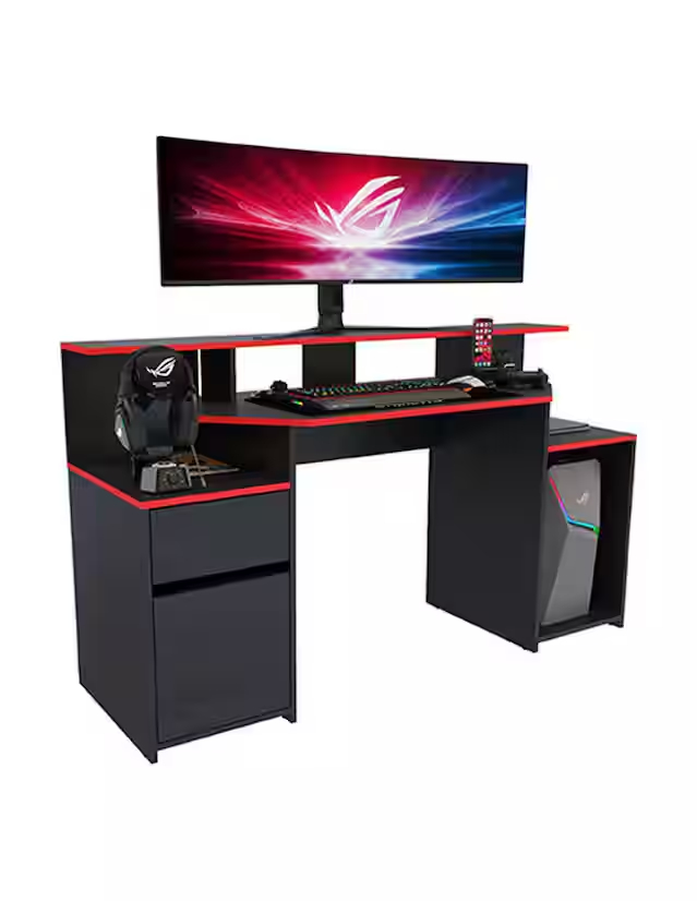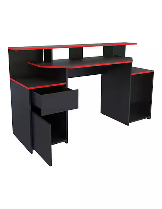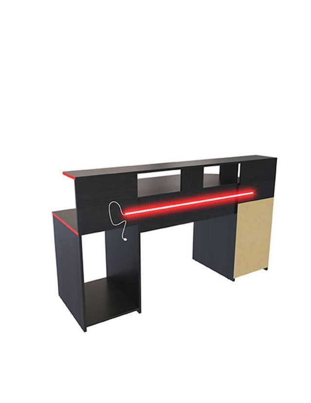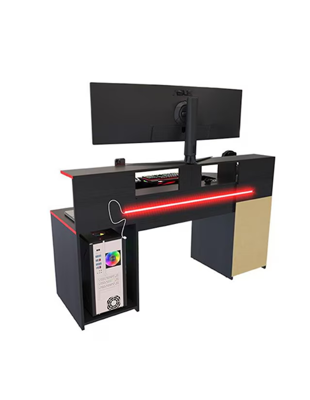 El Escritorio Gamer con Luces Ares cuenta con una amplia superficie de trabajo, una base hasta para dos monitores de 32 pulgadas cada uno, 1 cajón, 1 espacios abierto para CPU y 1 espacio cerrado con puerta abatible para que organices aparatos electrónicos u otros objetos. Este producto es fabricado y ensamblado en México; está fabricado en tablero aglomerado o MDP con recubrimiento melamínico, logrando dar estabilidad y durabilidad al mueble. Los herrajes son metálicos y cuenta con 5 años de garantía en las partes de madera y 1 año en la herrajería. Nuestra madera proviene de bosques 100% cultivados.