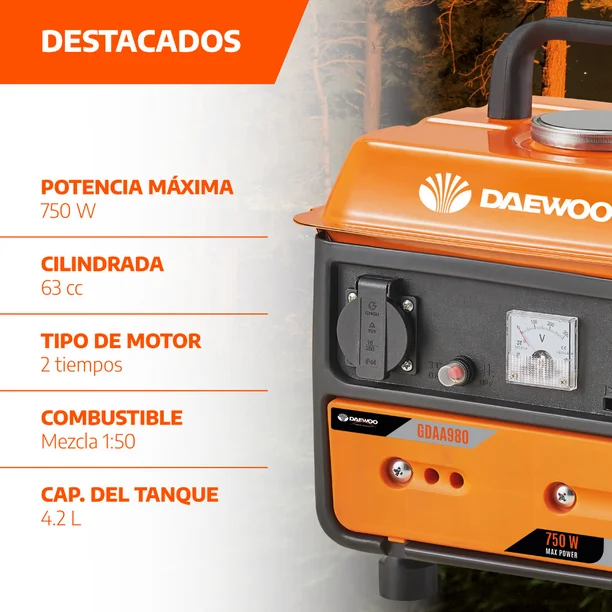 - ¿Sales de campamento? ¿Te quedaste sin luz en casa? El generador Daewoo GDAA980 900W portátil es una de las herramientas más útiles para realizar tus actividades sin preocuparte por los cortes de suministro. Además, es compacto, ocupa poco espacio y es fácil de usar. Fácil de transportar. Ideal para el hogar y aire libre. Bajo ruido y vibración.