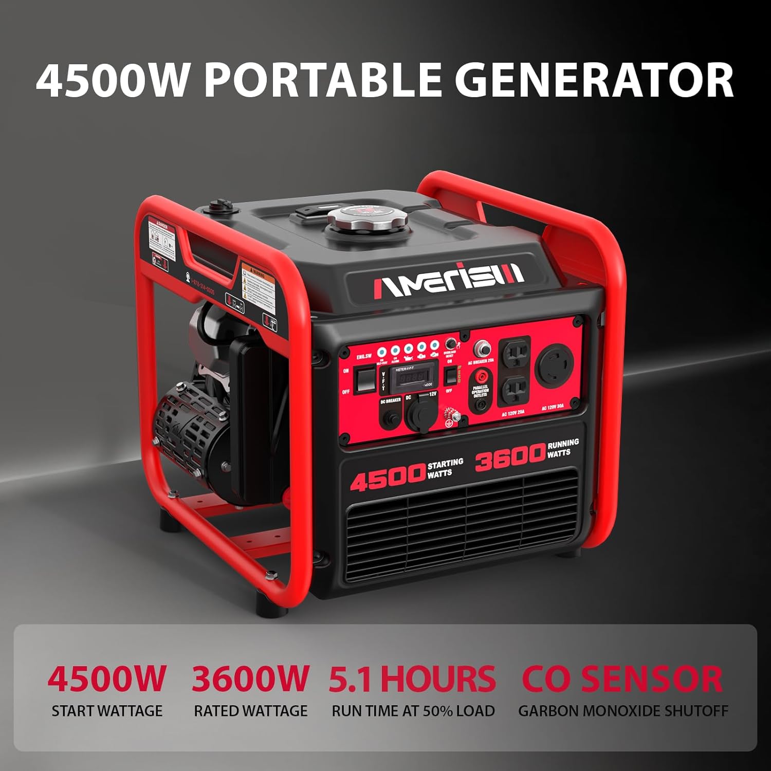 AMERISUN Generador inversor portátil de 4500 W alimentado a gas, sensor CO, ligero y silencioso para uso doméstico y respaldo de emergencia, camping, versión 2025 compatible con EPA