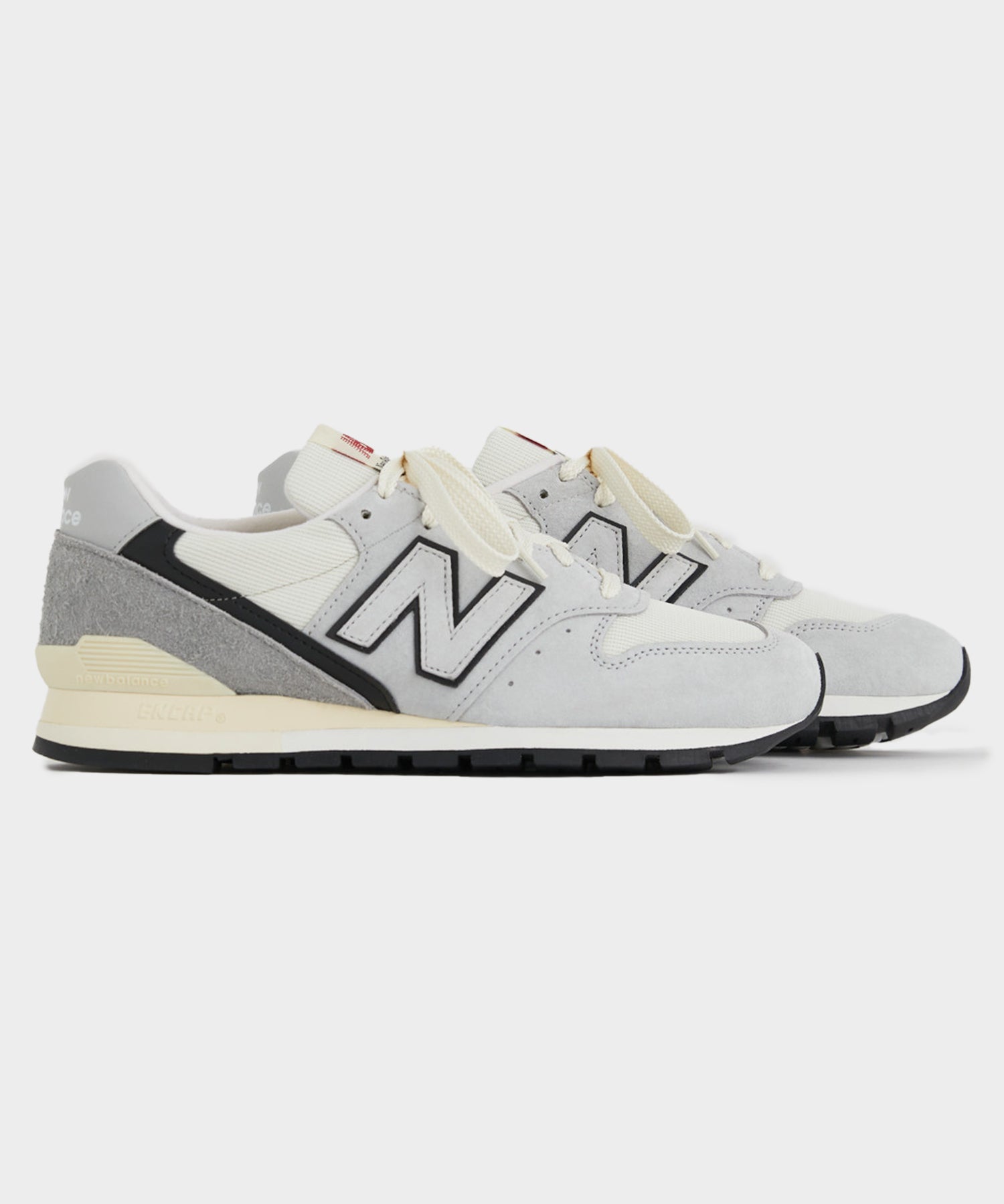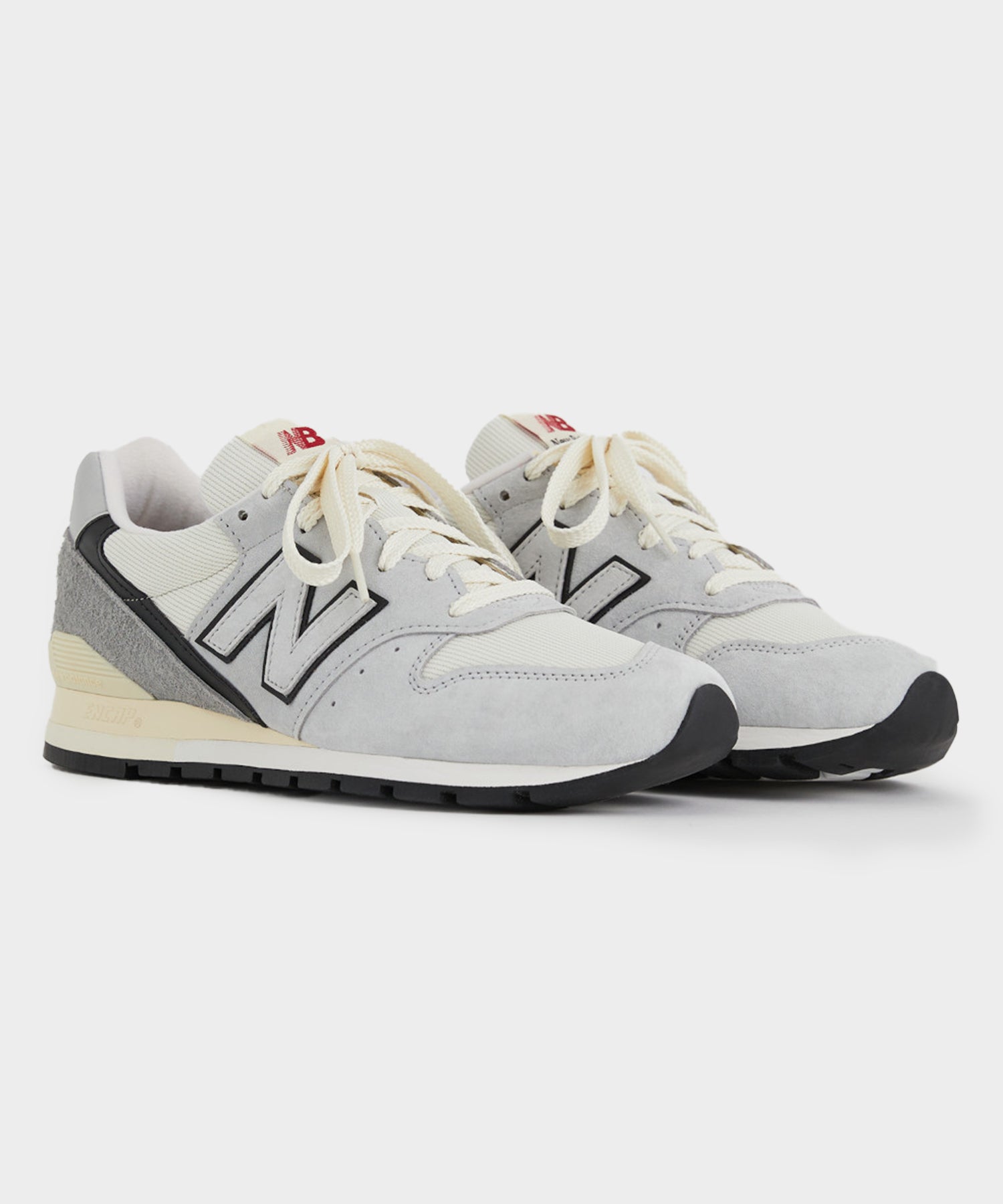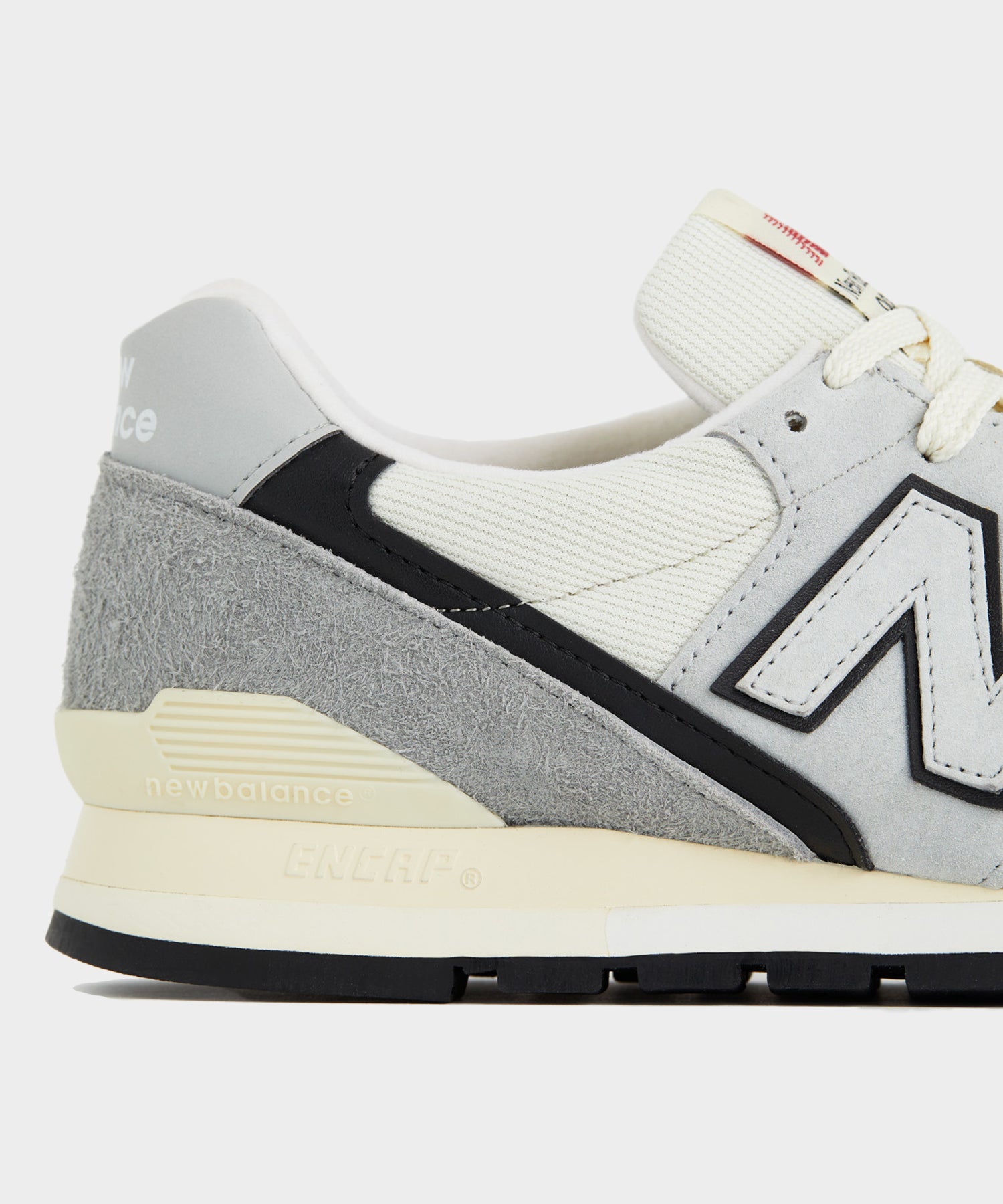 - The MADE in USA 996 features a mesh, suede, and hairy suede material mix, outfitted in 'grey matter', with black and white accents.