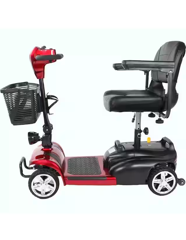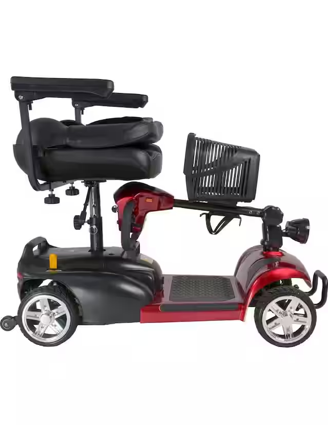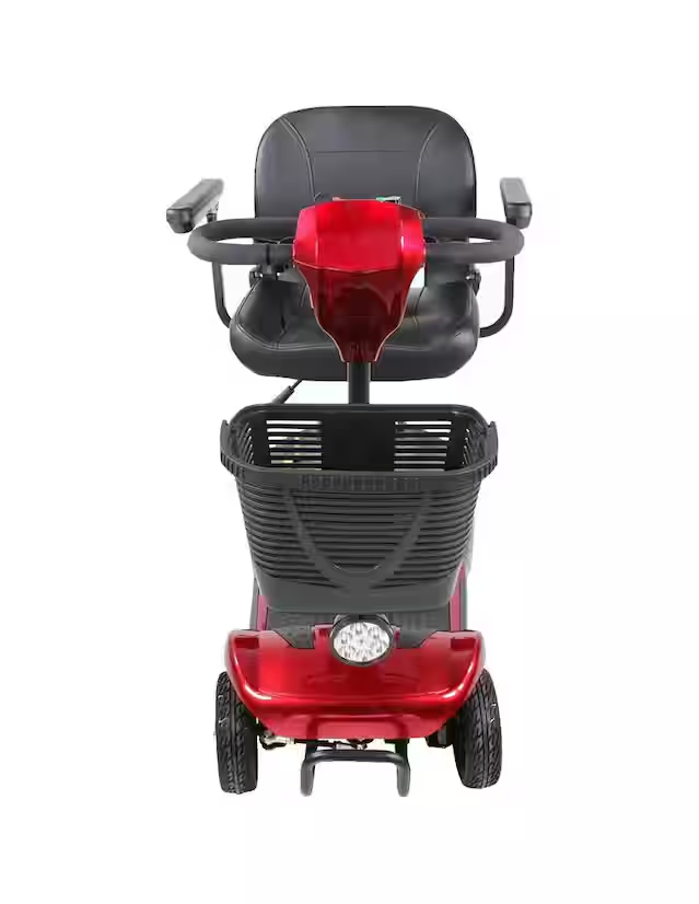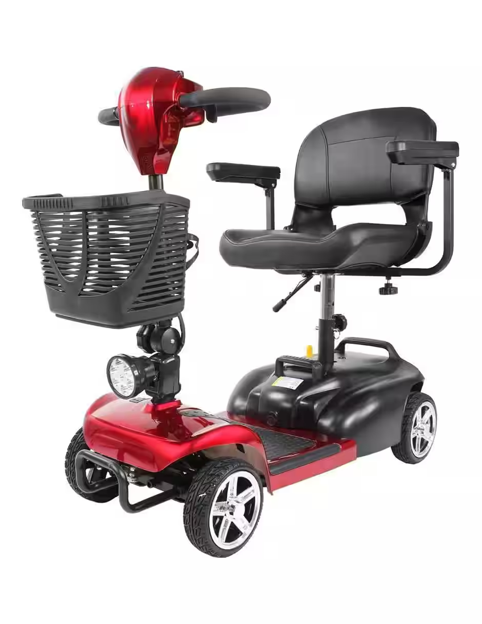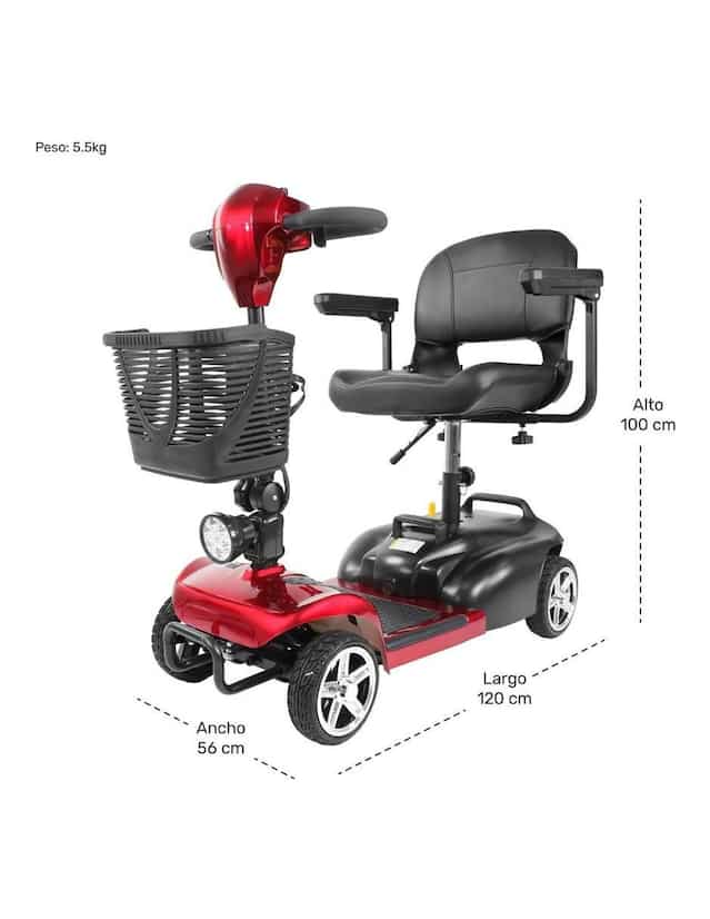 Silla de ruedas / carrito eléctrico tipo scooter con 4 ruedas, controles integrados en el manubrio, velocidad máxima de 8 km/h, cuenta con reversa y sonido de advertencia. Luces LED frontales. CARRITO TIPO SCOOTER. La silla de ruedas cuenta con un sistema eléctrico de 250W para funcionar, alcanza una velocidad de 8 km/h y puede dar marcha atrás hasta los 4 km/h con un sonido de advertencia cuando se coloca la reversa